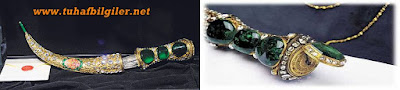 Bu tüyler “süpürge”ye de benziyor ki bu da “Allah’a kulluk etmek” anlamına gelirmiş. Tarihçilere göre bu olgu, tebası üzerinde muazzam bir güce sahip olan padişahlar için bir tür kendini sakinleştirme, “Benden büyük Allah var” deme yöntemi. Selçuklu sultanları da bu sembolü sık sık kullanırmış. Sorguç, zamanla vezirler, sultanlar hatta atların da başlarına takılır olmuş. Hazine Odası’nda, inci, yakut ve dev zümrütlü sorguçlar var. İri taşlı 17. yy’a ait zümrüt askılar da aynı yerde yer alıyor. Bu askılar padişahların oturdukları tahtın tavanında ya da tahtın bulunduğu salonun veya odanın tavanından aşağı bir zincirle asılırmış. Zümrütün bu kadar bol kullanılmasında Osmanlı İmparatorluğu’nun Mısır’ı ele geçirdikten sonra dünyadaki en önemli zümrüt ocağına da sahip olmasının payı büyük olmalı. Yeşim ve necef de bol kullanılan değerli taşlar arasında. III. Mustafa’nın süslü zırhı, iskeleti ceviz ağacından, dış yüzeyi altın yaldızlı sıvama gümüş olup üzeri elmas, yakut ve zümrütlerle donatılmış süslü bir beşik, mücevher kutuları, kuran kapakları, nişan ve madalyalar, Kâbe hediyeleri, muska ve hamaylı, örtü, kaftan, at koşu takımı ve at başlığı, saç bağı, hotoz, zülüflük, enselik, gerdanlık, iğne, çelenk, küpe, düğme, kemer, kemer tokası, zihgir, halhal, pazıbent, bilezik, yüzük, zincir, saat, köstek gibi eşya da yine Hazine Odası’nda...